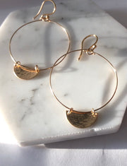 Description: These seriously cool handmade earrings feature a unique spin on a classic pair of hoops. They feature hand-forged wire with hand-hammered crescent / half moon geometric shapes. Gold-filled or sterling silver ear wires. Arrives tastefully packaged and ready for gift-giving in a beautiful and reusable box with ribbon.