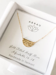 A perfect necklace for wearing alone or for layering. This necklace features a half moon, hand-hammered pendant. 16" + 2" extender fine cable chain with spring ring clasp. Choose from rose gold, yellow gold-filled or sterling silver (.925).