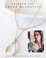 This simple, minimalistic style necklace has been worn on Sweet Magnolias episode 5, season 6 on Actress Harlan Drum who plays “CeCe”. It features a gold bronze wishbone charm strung on a delicate 14k gold-filled chain and finished with a spring ring clasp. Also available in sterling silver .925. Abrau brand tag attached. This looks great worn on its own or layered with another necklace. As seen in first photo with a satellite chain. Extends from 16" to 18" chain lengths.